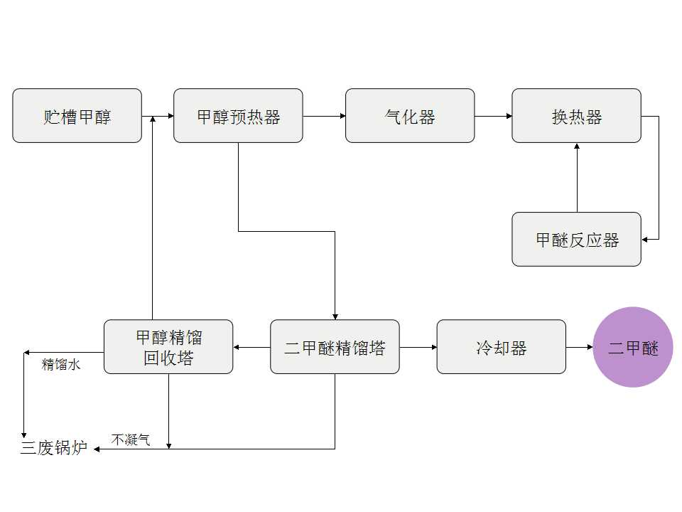 粗甲醇經二甲醚精餾塔出 口冷凝器預熱后,送入甲醇氣化器,用甲醇反應熱把甲醇汽化,汽化后的甲醇經反應器出 口換熱器換熱升溫,在220℃左右經開車電加熱器送入反應器上部,在260---280℃之間,經催化反應后,出反應器,經出 口換熱器換熱降溫后,進入甲醇回收塔再沸器,替代部分蒸汽加熱二甲醚精餾后殘液,同時繼續降溫,后經甲醇冷卻到1000℃左右送入二甲醚精餾塔,精餾出二甲醚,經降溫后送入成品灌區。